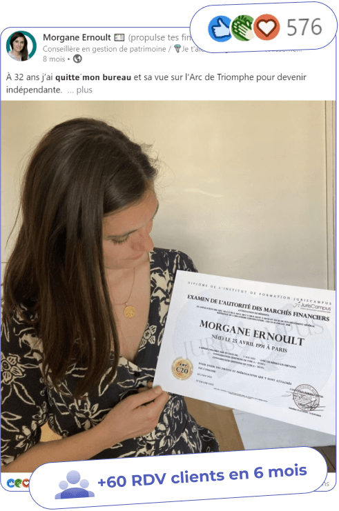 Morgane Ernoult, conseillère en gestion de patrimoine, a fait +500 likes avec son 1er post grâce à mes conseils.