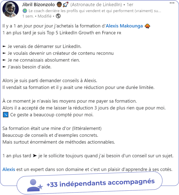 Je suis devenu expert LinkedIn, me classant dans le top 1% LinkedIn selon Favikon. En 2 ans, j’ai formé et accompagné +200 personnes. LinkedIn seul m’a permis de faire +10k€ par mois !